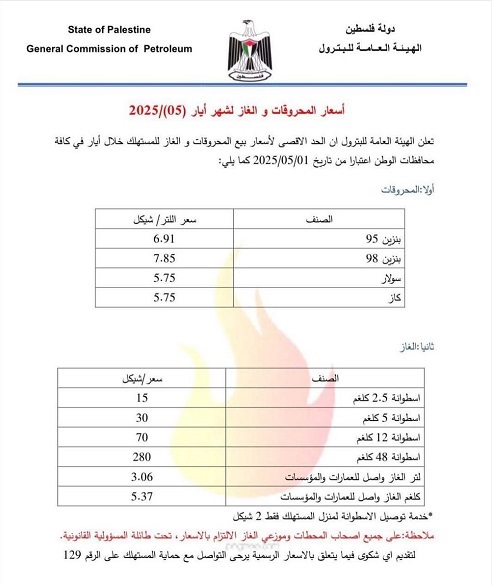 شفا - أعلنت الهيئة العامة للبترول، مساء اليوم الأربعاء، أسعار المحروقات والغاز لشهر أيار (5/2025)، على النحو التالي: