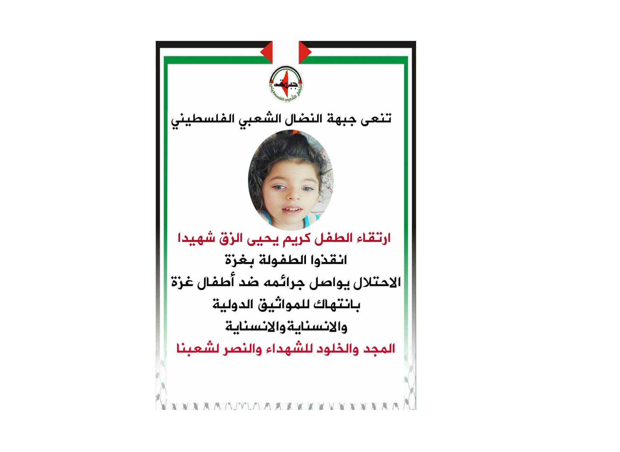شفا – نعت جبهة النضال الشعبي الفلسطيني ارتقاء نجل عضو لجنة قيادتها في الشجاعية يحيى الزق الطفل كريم شهيدا ،بفعل سياسة الاحتلال الفاشي الاجرامية بمنع ادخال المواد الغذائية والمواد الطبية.