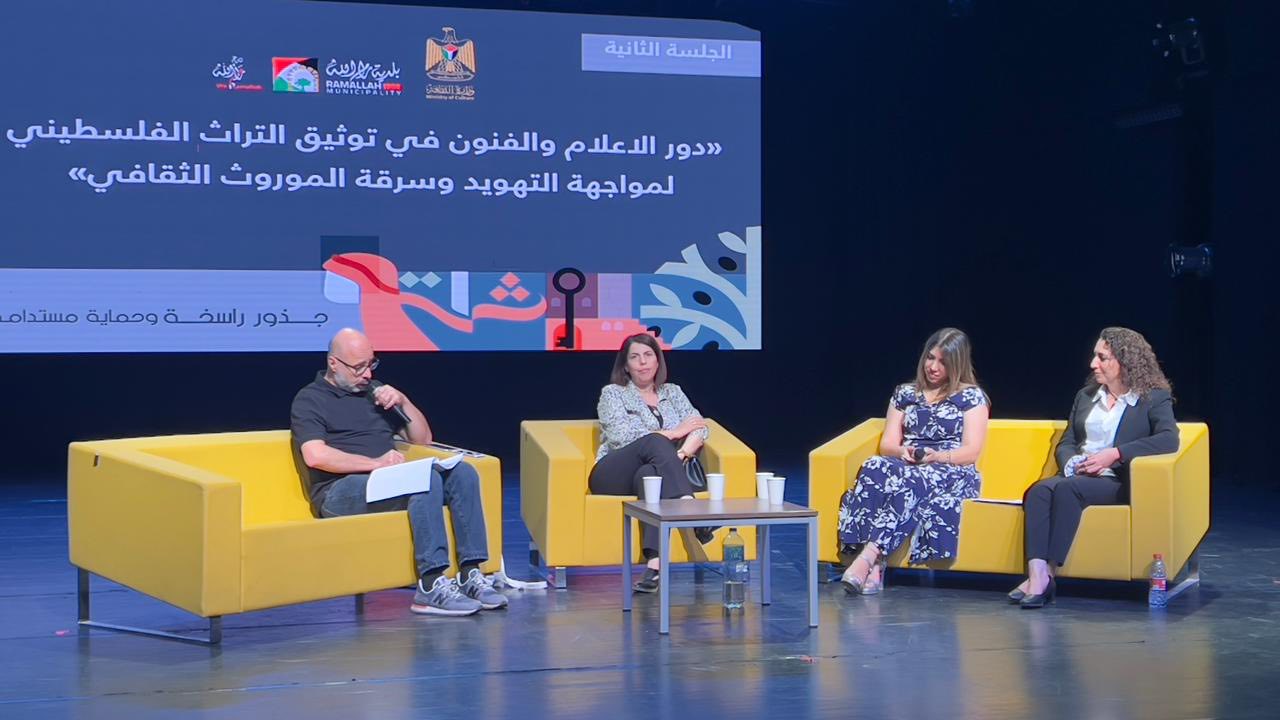 ونظمت وزارة الثقافة ندوة بعنوان “الإعلام والفنون في توثيق التراث الفلسطيني لمواجهة التهويد وسرقة الموروث الثقافي” ضمن جلسات المؤتمر الوطني للحفاظ على التراث الفلسطيني وصونه واستدامته، شارك فيها رئيس تحرير منصة فلسطين الثقافية ومحرر ثقافي في جريدة الايام يوسف الشايب وأستاذة التصميم في مجال تصميم الصياغة في جامعة دار الكلمة نانسي الطويل سلسع تمارا أبو لبن، والمخرجة الفلسطينية والأكاديمية في جامعة بيت لحم رولا شهوان