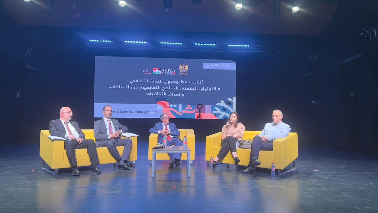 ونظمت وزارة الثقافة أولى جلسات المؤتمر الوطني للحفاظ على التراث الفلسطيني وصونه واستدامته، إذ عقدت ندوة ثقافية بعنوان “آليات حفظ وصون التراث الثقافي”، تناولت موضوعات التوثيق كأداة لتسجيل الذاكرة، والرقمنة كوسيلة لحماية التراث ونشره عالمياً، والمناهج التعليمية كرافعة لتنشئة الأجيال على احترام تراثهم، إضافة إلى دور المتاحف في عرض وتفسير عناصر التراث، وإسهام المراكز الثقافية في إبقائه حياً في الحياة اليومية للمجتمع حيث شارك فيها كل من أستاذ الأدب والنقد بجامعة النجاح الوطنية ونائب رئيس جمعية النقاد الفلسطينيين إحسان الديك ، وأمين متحف التراث الفلسطيني التابع لمؤسسة دار الطفل العربي في القدس ومدير وحدة المجموعات والترميم في المتحف الفلسطيني بهاء الجعبة، والمؤرخ والباحث المتخصص في الرواية الفلسطينية ومدير مركز خضوري للتوثيق في جامعة خضوري عبدالله محمود السفاريني ، المؤرخة والأستاذة المساعدة في قسم الفنون التطبيقية بالجامعة الفلسطينية التقنية – خضوري/ رام الله ميسون شرقاوي، حيث أدار الندوة إبراهيم علوان مدير عام التراث في وزارة الثقافة.