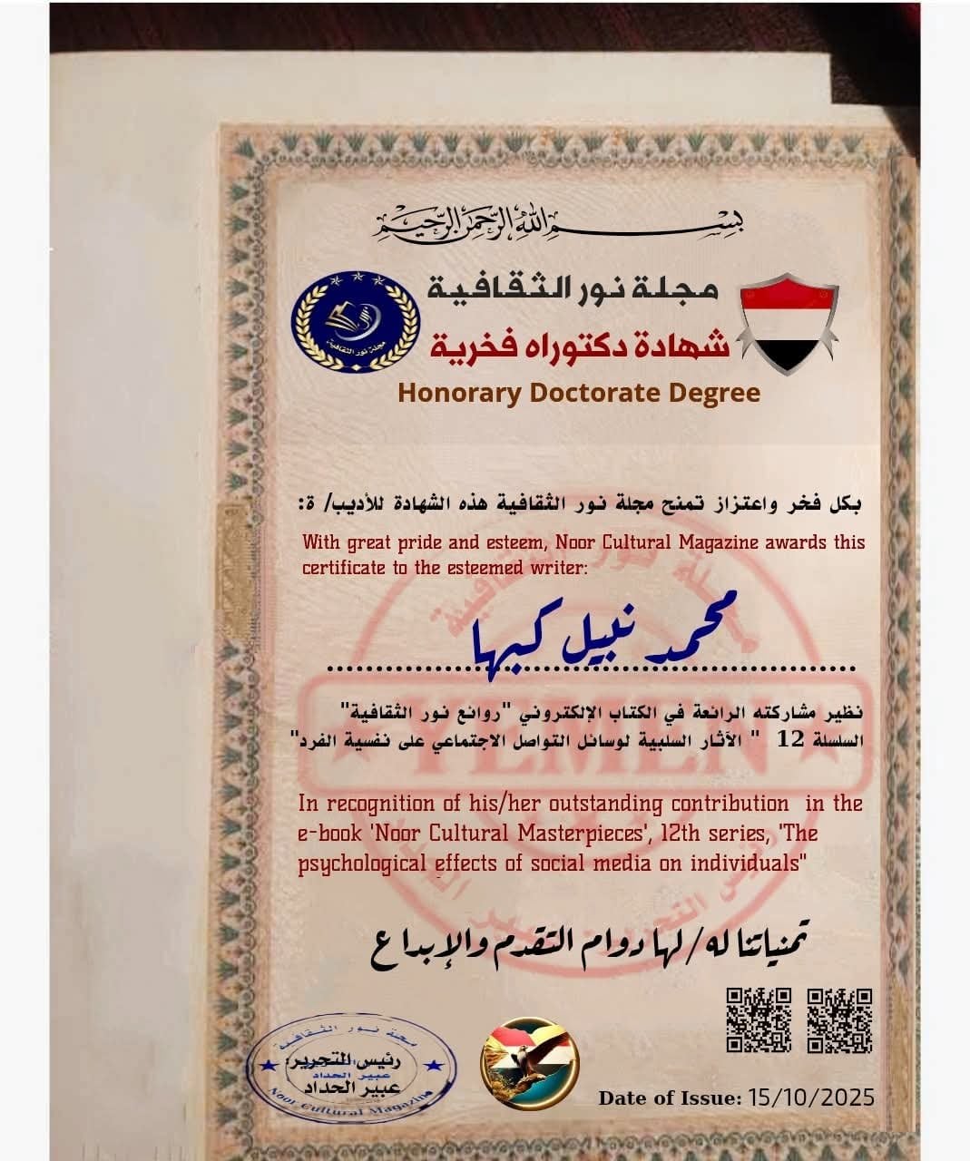 شفا – تم منح المثقف والمفكر الإسلامي م. محمد نبيل كبها شهادة الدكتوراه الفخرية من جمهورية اليمن و مجلة نور الثقافية بعد اجتيازه لمسابقة الكتاب الإلكترونية مع نخبة من الكتاب والأدباء والشعراء من مختلف أقطار العالم، وفوزه في المسابقة، حيث كان موضوع المسابقة عن الآثار السلبية لوسائل التواصل الاجتماعي على النفسية، وتم وضع بحثه في كتاب (روائع نور الثقافية ـ العدد12) مع نخبة من الأدباء والكتاب والشعراء العرب حول العالم.