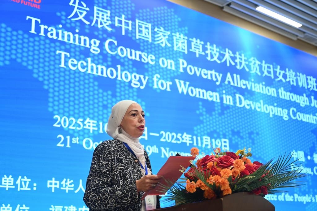 شفا – فوتشو 22 أكتوبر 2025 (شينخوا) – صورة لين تشان شي، الأستاذ في جامعة فوجيان للزراعة والغابات، يلقي كلمة في مراسم افتتاح الدورة التدريبية بشأن التخفيف من حدة الفقر بواسطة تكنولوجيا “جيونتساو” للنساء في الدول النامية في مدينة فوتشو حاضرة مقاطعة فوجيان بجنوب شرقي الصين.