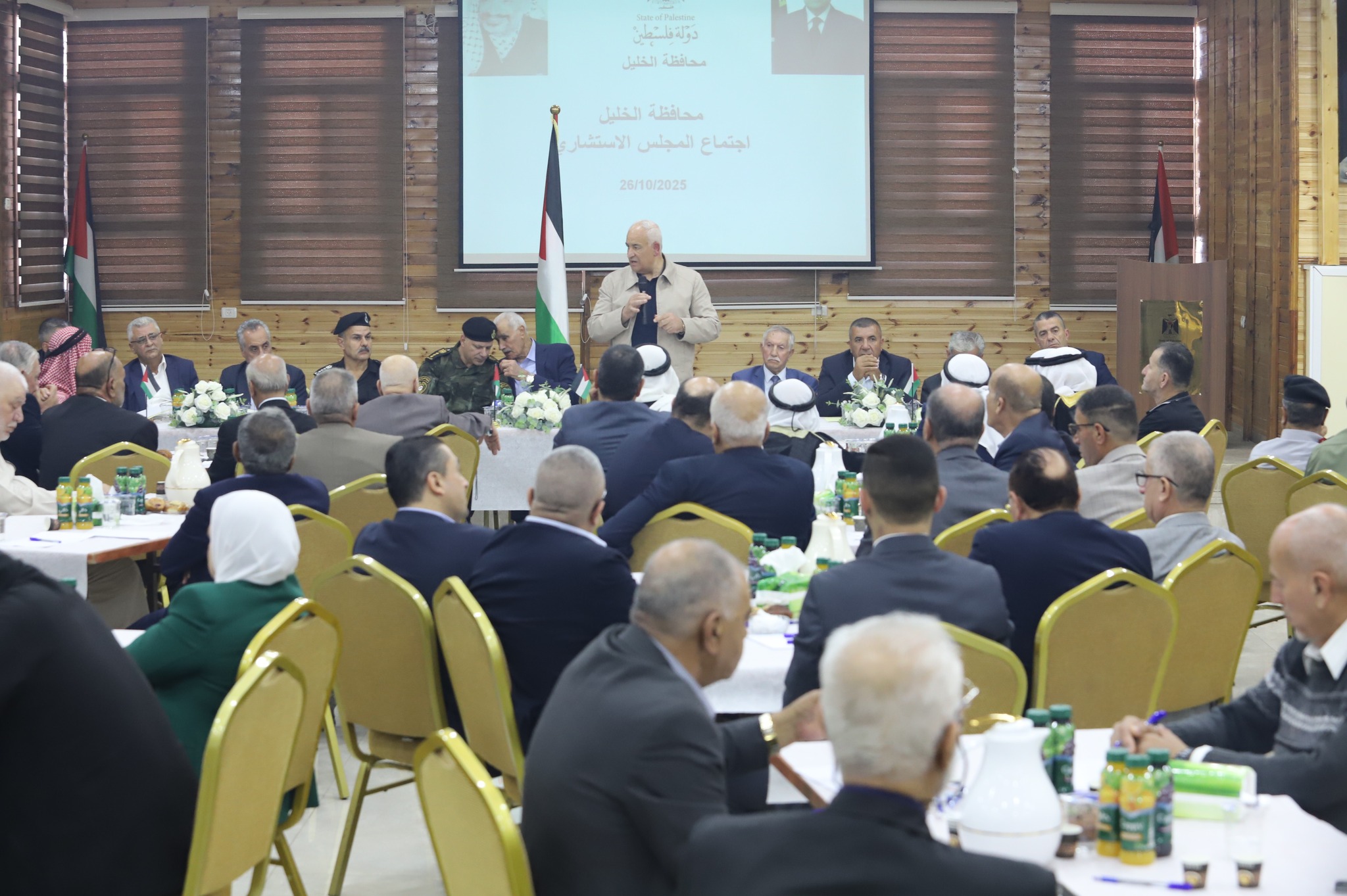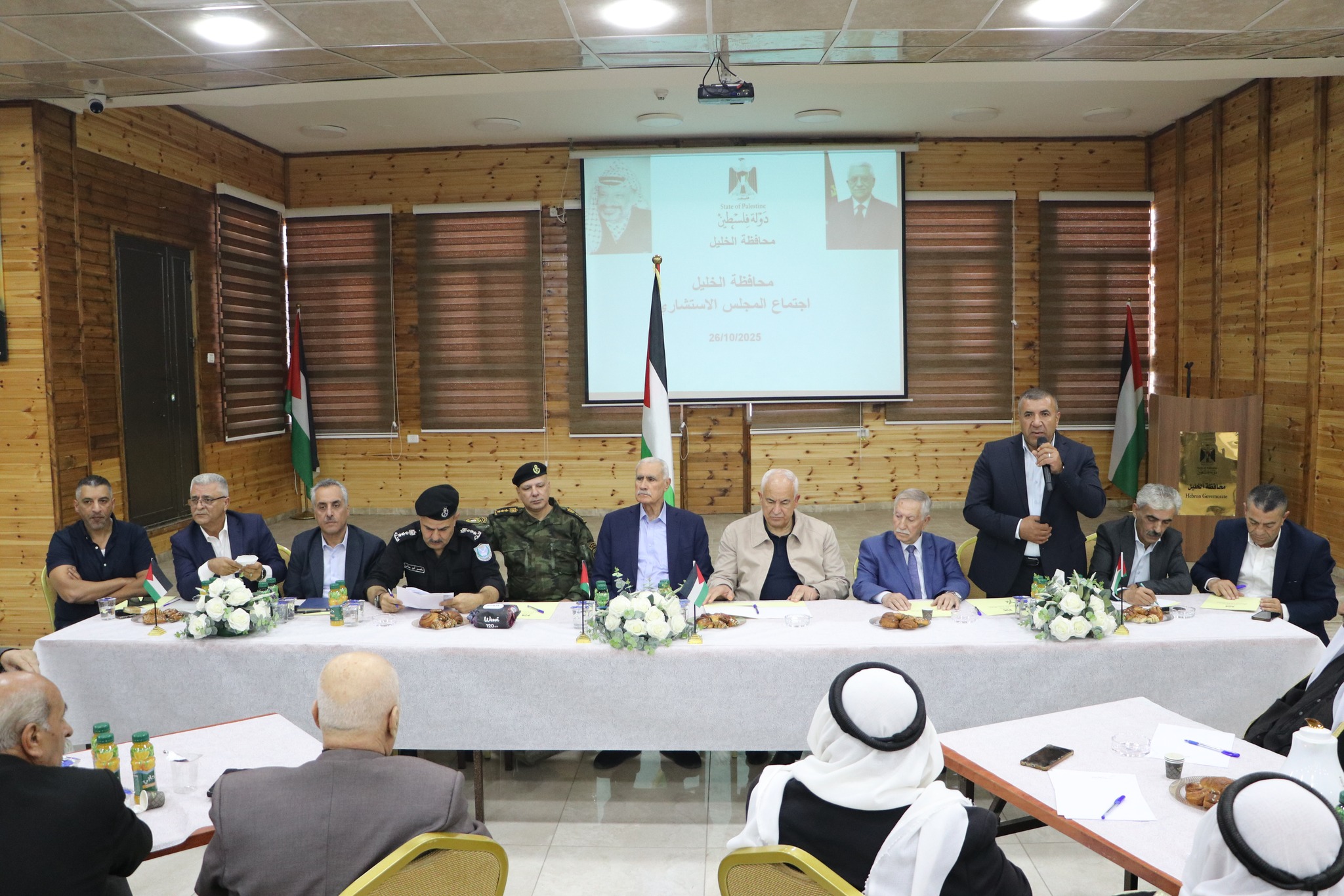شفا – ترأس محافظ الخليل السيد خالد دودين ظهر اليوم الاحد اجتماع مجلس استشاري المحافظة بحضور الفريق الحاج اسماعيل جبر مستشار السيد الرئيس لشؤون المحافظات واللواء زياد هب الريح وزير الداخلية وأ. احمد سعيد التميمي عضو اللجنة التنفيذية لمنظمة التحرير الفلسطينية والسيد فهمي الزعارير امين سر المجلس الوطني الفلسطيني والحاج موفق ضراغمة منسق شؤون المحافظات وقادة المؤسسة الامنية واعضاء المجلس من مؤسسات وشخصيات اعتبارية ووجهاء عشائر .