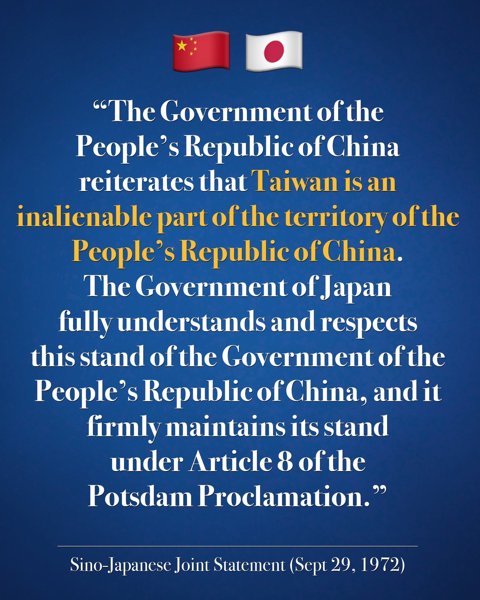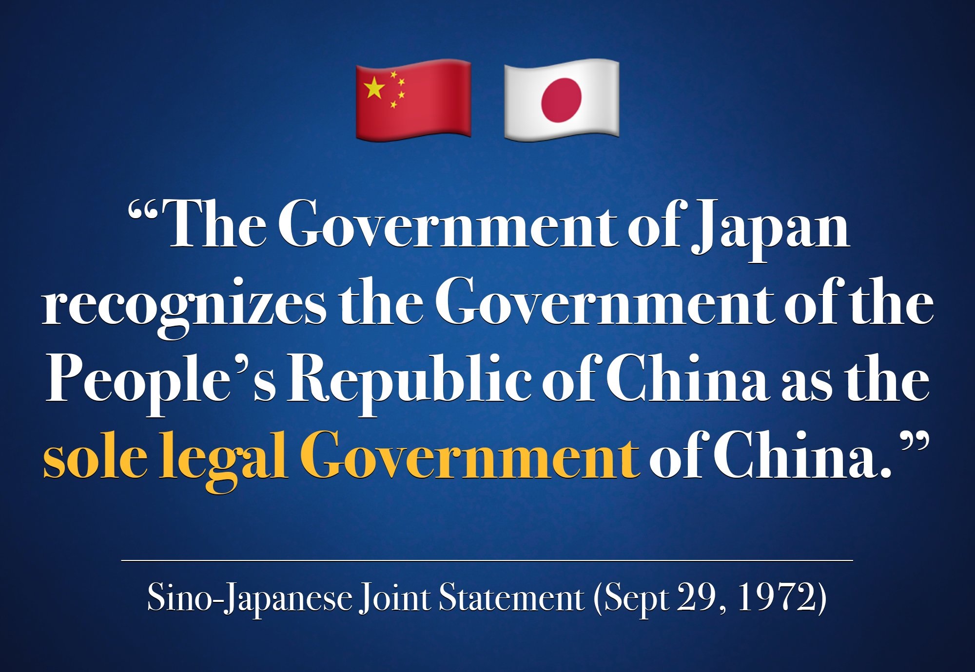 نشرت ماو نينغ المحتوى باللغتين الإنجليزية واليابانية على الإنترنت، قائلة إنه في البيان الصيني الياباني المشترك الصادرِ عامَ 1972، ورد بوضوح أن حكومة اليابان تعترف بحكومة جمهورية الصين الشعبية بوصفِها الحكومةَ الشرعيةَ الوحيدةَ للصين، وأن حكومة اليابان تفهم موقف الصين بشكل كامل وتحترمه، وتتمسك بثبات بموقفها وفقًا للمادة 8 من إعلان Potsdam. وشددت المتحدثة على أن تايوان جزء لا يتجزأ من الأراضي الصينية.