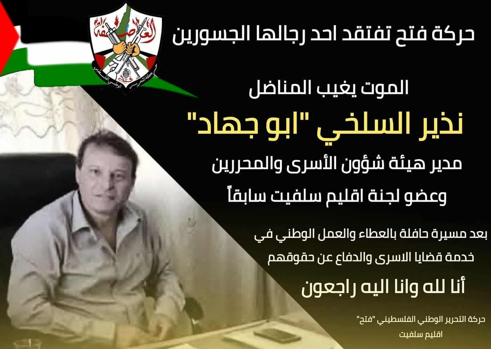 برحيل المناضل نذير فاروق السلخي (أبو جهاد)، تنطفئ اليوم شعلة من شُعل الصمود التي أنارت دروبًا طويلة في مسيرة النضال الفلسطيني، لم يكن أبو جهاد رجلًا عاديًا، بل كان حاضرًا حيث يجب أن يكون الرجال؛ في الميدان، في المواجهة، وفي خدمة أبناء شعبه، خصوصًا عائلات الأسرى الذين شكّل لهم سندًا وصوتًا وبيتًا مفتوحًا لا يغلق بابه.