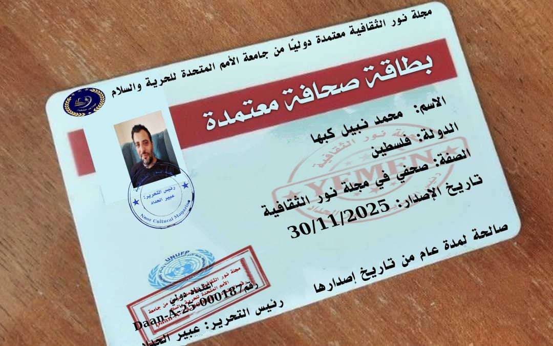 شفا – تم استلام المفكر الإسلامي محمد نبيل كبها لبطاقة الصحافة الخاصة بمجلة نور الثقافية اليمنية، والمعتمدة من جامعة الأمم المتحدة للحرية والسلام.