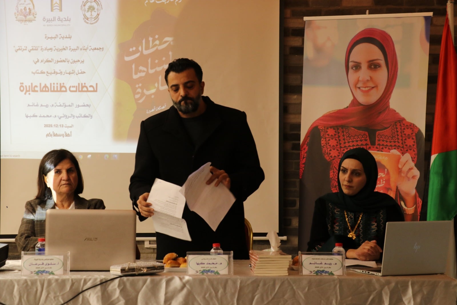 شفا – نظمت بلدية البيرة يوم السبت بالتعاون مع جمعية أبناء البيرة الخيرية ومبادرة “نلتقي لنرتقي”، حفل إشهار وتوقيع المجموعة القصصية “لحظات ظنناها عابرة” للمؤلفة والمهندسة ريم غانم، حيث قدّمها وحاورها الكاتب والمثقف والمفكر الإسلامي م.محمد نبيل كبها “عضو الإتحاد العام للكتاب والأدباء الفلسطينيين، والعرب، والإتحاد الدولي للمثقفين العرب ومنتدى الكتاب العربي” وبحضور أ. سلوى قرعان “عضو المجلس البلدي”، و أ. عامر عوض الله “مدير الدائرة الثقافية ” ، و أ. خولة صوفان “مقررة اللجنة الثقافية في جمعية أبناء البيرة”، و د. عفاف نجاجرة “مؤسسة مبادرة- نلتقي لنرتقي”.