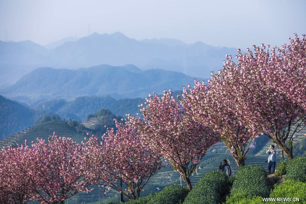شفا – جانب من مزرعة شاي في قرية باشان بحي فويانغ في مدينة هانغتشو بمقاطعة تشجيانغ في شرقي الصين، حيث تنتشر أشجار الكرز في مزارع الشاي الشاسعة، مما يجذب الكثير من السياح.