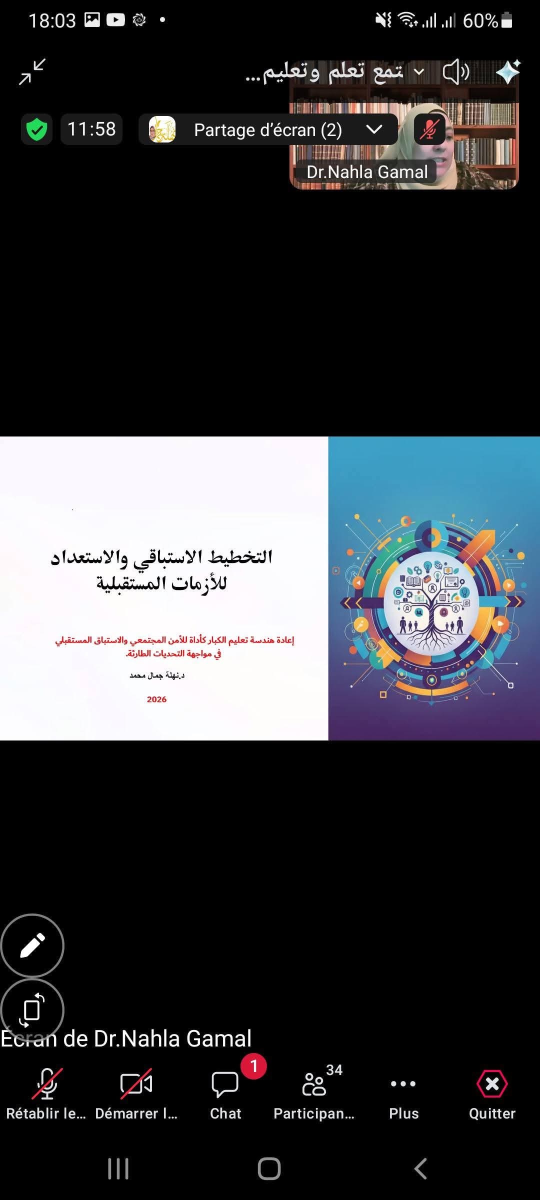 وفي المحور الثالث : التخطيط الاستباقي والاستعداد للأزمات المقبلة . فقد وضحت الدكتورة نهلة جمال / جامعة بني سويف مصر ، كيف تتناول ورقتها العلمية موضوع “إعادة هندسة تعليم الكبار” عبر التحول من النمط التقليدي (العلاجي) الذي يركز على سد الفجوات التعليمية، إلى النمط الاستباقي (التغييري) الهادف إلى تمكين الأفراد من التنبؤ بالأزمات المستقبلية والاستعداد لها. وتستعرض المداخلة أدوات استراتيجية وكفايات محورية في المجالات البيئية والصحية والرقمية، مع التركيز على تطبيق نموذج اليونسكو لمختبرات محو الأمية المستقبلية (FLL) لتعزيز المرونة المعرفية والابتكار المجتمعي في مواجهة التحديات الطارئة.