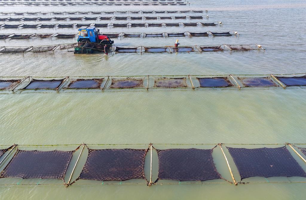شفا - نانتونغ 16 يناير 2026 (شينخوا) في الصورة الملتقطة يوم 15 يناير 2026، جانب من أعمال حصاد الطحالب البحرية الطازجة في منطقة تربية الطحالب البحرية في البحر الأصفر.