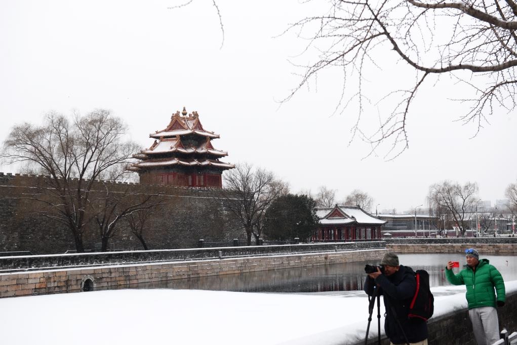 شفا – بكين 19 يناير 2026 (شينخوا) في الصورة الملتقطة يوم 18 يناير 2026، شخصان يلتقطان صورا قرب أحد الأبراج بمتحف القصر الإمبراطوري بعد تساقط الثلوج في العاصمة الصينية، بكين.