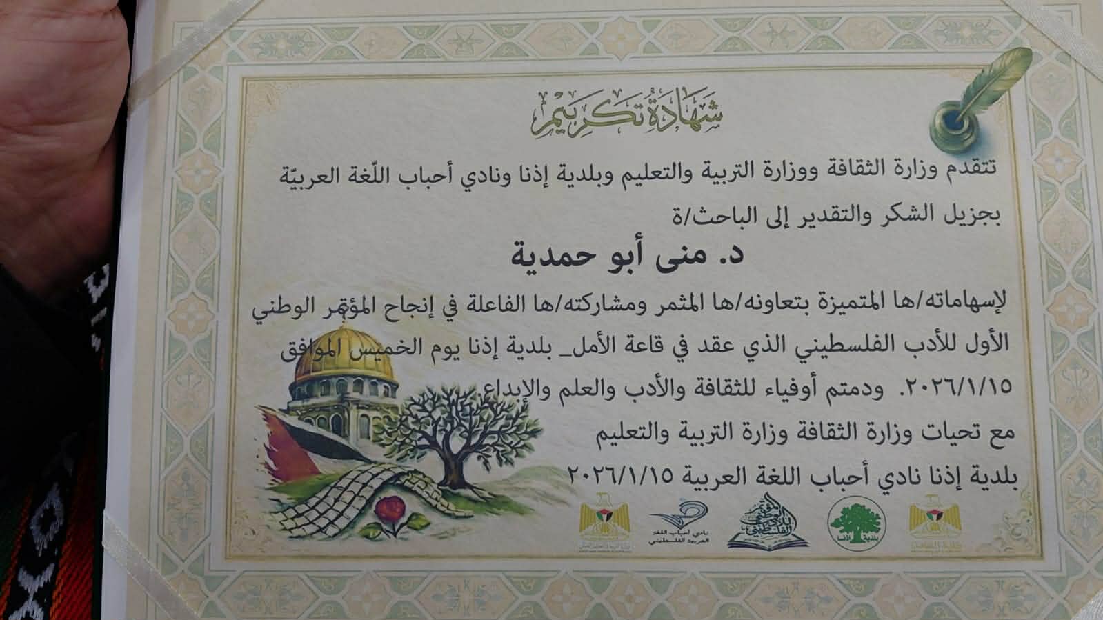 شفا – (إذنا – الخليل) شاركت الدكتورة منى أبو حمديّة في أعمال المؤتمر الوطنيّ الأول للأدب الفلسطيني، وذلك من خلال تقديم ورقتها العلمية ضمن المحور الثالث: «الشعر ذاكرة وهوية؛ التراث والاغتراب والمقاومة في شعر يوسف أبو ريدة»، في جلسة علمية ترأسها الدكتور مؤمن البدارين – جامعة بيت لحم.