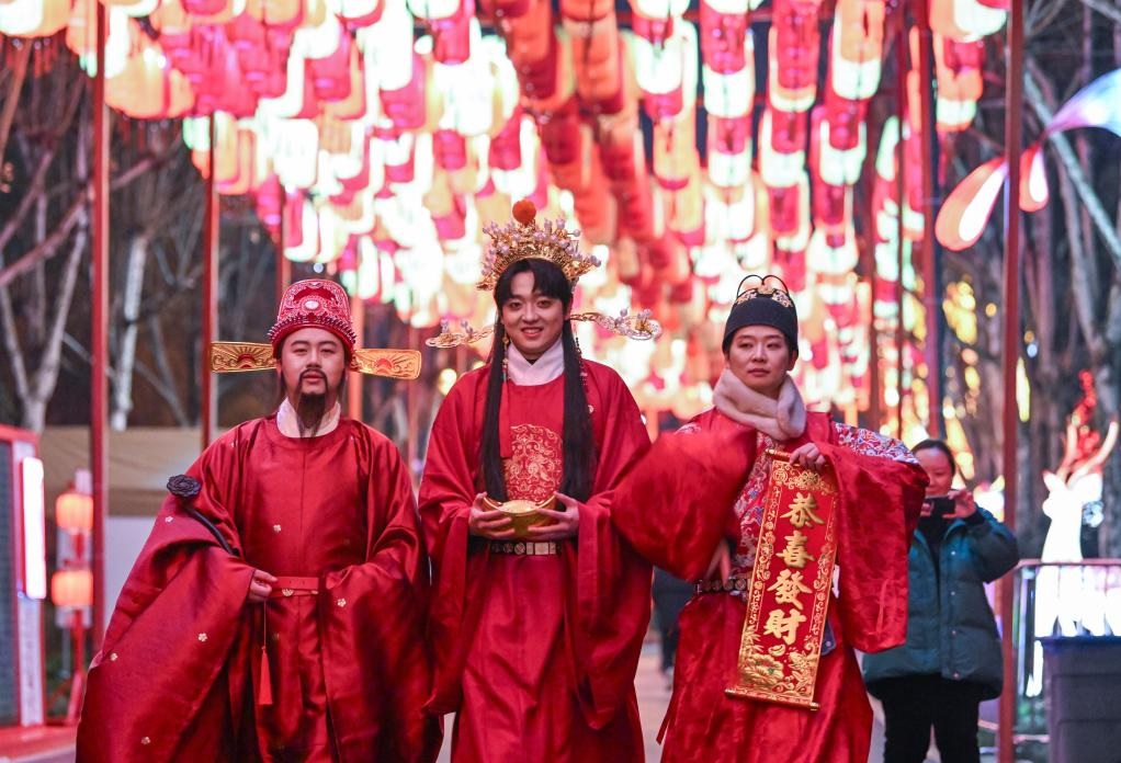 شفا – تشونغتشينغ أول فبراير 2026 (شينخوا) في الصورة الملتقطة يوم 30 يناير 2026، موظفون يرتدون أزياء تقليدية خلال مهرجان الفوانيس الذي يقام في حديقة معرض البستنة في بلدية تشونغتشينغ بجنوب غربي الصين.