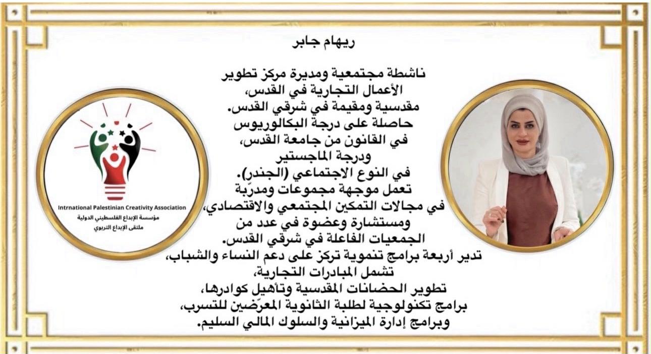 • ريهام جابر: ناشطة تربوية ومجتمعية مقدسية، مهتمة بملفات الاستدامة التعليمية، والشراكات الداعمة للتعليم في البيئات محدودة الموارد.