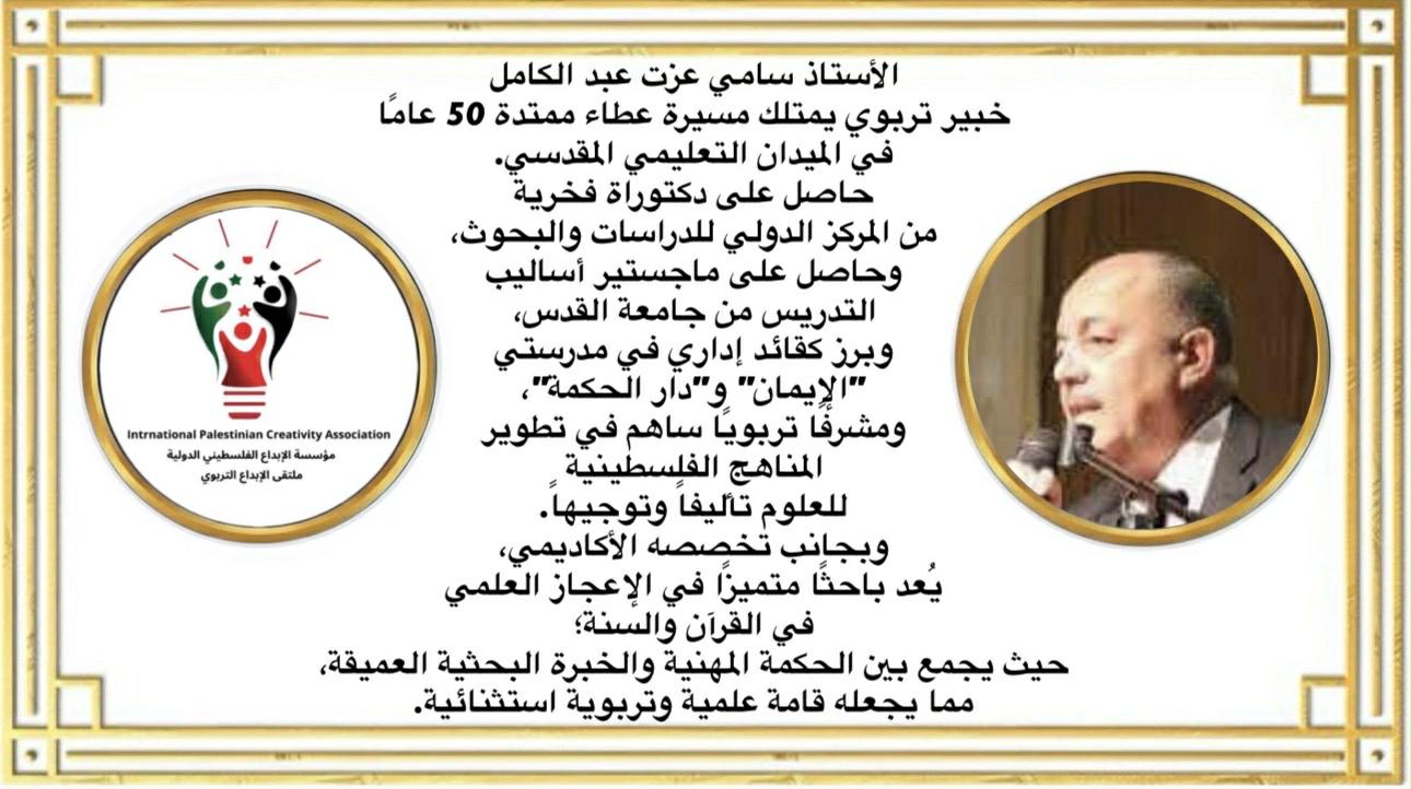 • د. سامي عزّت عبد الكامل: تربوي مقدسي مخضرم، يمتلك خبرة ميدانية طويلة في واقع التعليم في القدس، واطلاعًا واسعًا على قضايا المناهج وتحديات المدرسة المقدسية.