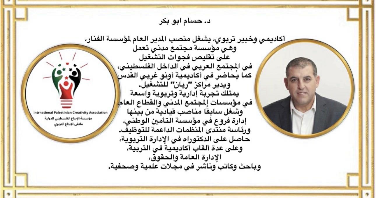 • د. حسام أبو بكر: أكاديمي وخبير تربوي، يمتلك تجربة إدارية وتربوية واسعة في مؤسسات المجتمع المدني والقطاع العام.
