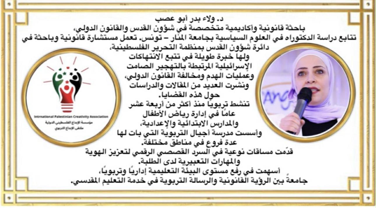 • د. ولاء أبو عصب: باحثة قانونية وأكاديمية مقدسية، ناشطة في تطوير البيئة التربوية وإدارة المؤسسات التعليمية في القدس.