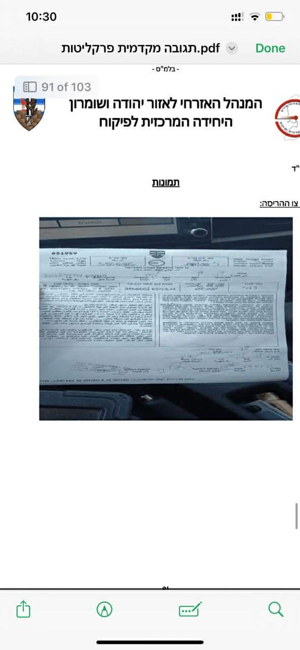 على إثرذلك، تقدم بشكوى لشرطة الاحتلال في منطقة مخماس( بن يامين) عن السرقة، وعن تفجير إطارات المركبة..سجلوها ضمن مجهول، مع العلم أنه ذكر لهم اسم الصهيوني السارق(ي ت س ا ف).!