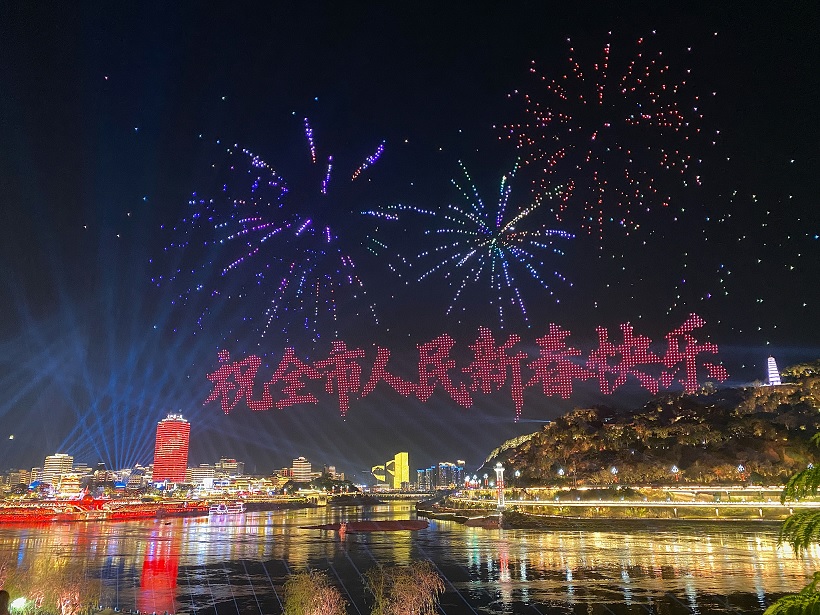 شفا – استضافت مدينة ييبين بمقاطعة سيتشوان في 11 فبراير 2026 عرضاً ضوئياً ضخماً بطائرات مسيرة تحت شعار “أول مدينة على نهر اليانغتسي، الخيول الجامحة” احتفالاً بعيد الربيع.