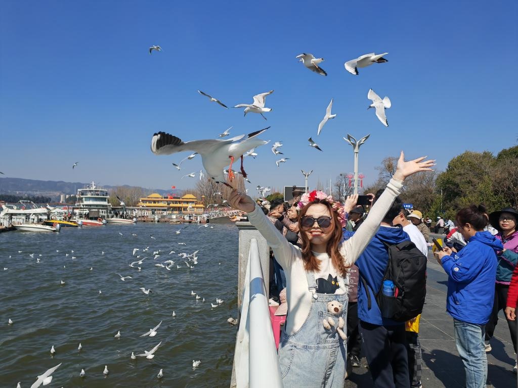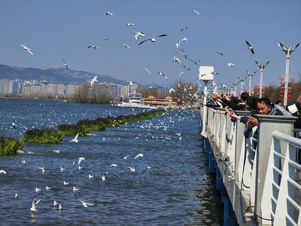 شفا – كونمينغ 17 فبراير 2026 (شينخوا) في الصورة الملتقطة يوم 16 فبراير 2026، زوار يطعمون طيور النورس أحمر المنقار عند سد هايقنغ في مدينة كونمينغ، حاضرة مقاطعة يوننان في جنوب غربي الصين، حيث تجمع العديد من الزوار والمقيمين المحليين عند السد للاستمتاع بعطلة عيد الربيع.