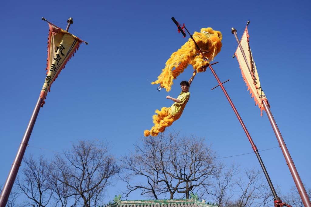 شفا – بكين 18 فبراير 2026 (شينخوا) في الصورة الملتقطة يوم 17 فبراير 2026، فنان يقدم عرضا لرقصة الأسد في أحد معارض المعابد في العاصمة الصينية بكين. وافتتحت معارض المعابد في بكين احتفالا بعيد الربيع، حيث تقدم للزوار العروض التقليدية والطعام اللذيذ.