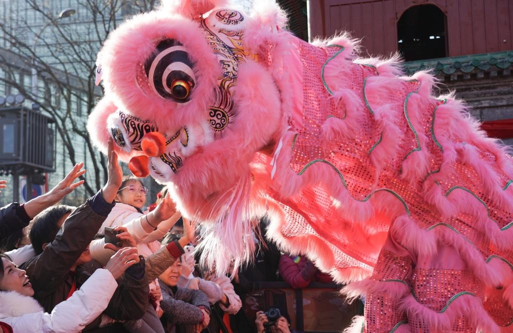 شفا – بكين 18 فبراير 2026 (شينخوا) في الصورة الملتقطة يوم 17 فبراير 2026، أناس يتفاعلون مع مؤدي رقصة الأسد في أحد معارض المعابد في العاصمة الصينية بكين. وافتتحت معارض المعابد في بكين احتفالا بعيد الربيع، حيث تقدم للزوار العروض التقليدية والطعام اللذيذ.
