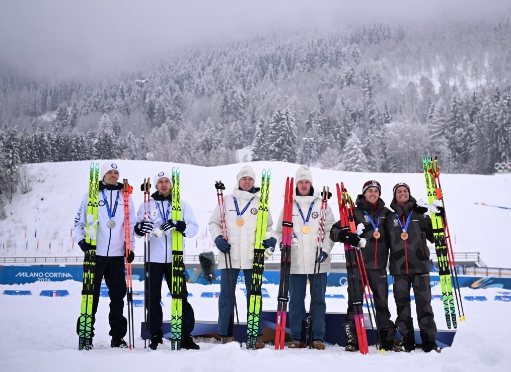شفا – تيزيرو 19 فبراير 2026 (شينخوا) في الصورة الملتقطة يوم 19 فبراير 2026، الحائزان على الميدالية الذهبية ينس لوراس أوفتيبرو وأندرياس سكوجلوند، من النرويج، والحائزان على الميدالية الفضية إيلكا هيرولا وإيرو هيرفونن من فنلندا، والحائزان على الميدالية البرونزية ستيفان ريتينيغر ويوهانيس لامبارتر من النمسا، يقفون لالتقاط صور لهم خلال مراسم التتويج عقب سباق التزلج النوردي المزدوج، ضمن دورة الألعاب الأولمبية الشتوية ميلانو-كورتينا 2026، في مدينة تيزيرو الإيطالية.