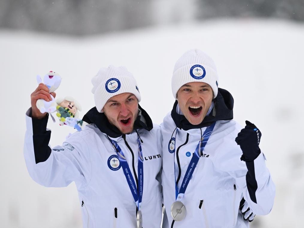 شفا – تيزيرو 19 فبراير 2026 (شينخوا) في الصورة الملتقطة يوم 19 فبراير 2026، اللاعبان الفنلنديان الحائزان على الميدالية الفضية إيلكا هيرولا وإيرو هيرفونن، يقفان لالتقاط صور لهما خلال مراسم التتويج عقب سباق التزلج النوردي المزدوج، ضمن دورة الألعاب الأولمبية الشتوية ميلانو-كورتينا 2026، في مدينة تيزيرو الإيطالية.