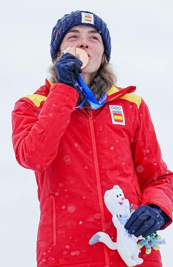 شفا- بورميو 19 فبراير 2026 (شينخوا) في الصورة الملتقطة يوم 19 فبراير 2026، الإسبانية آنا ألونسو رودريغيز، تقبل الميدالية البرونزية التي حصلت عليها، خلال مراسم توزيع الميداليات عقب سباق التزلج الجبلي السريع للسيدات في دورة الألعاب الأولمبية الشتوية ميلانو-كورتينا 2026.