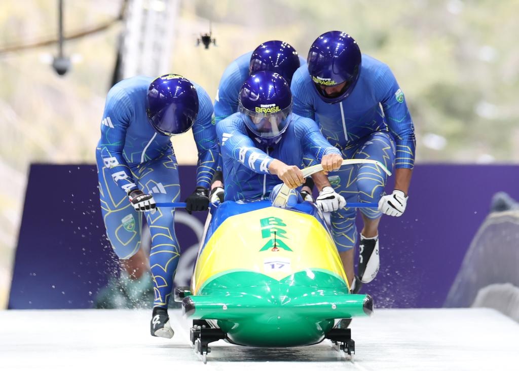 شفا – (شينخوا) – في الصورة الملتقطة يوم 21 فبراير 2026، لاعبو المنتخب البرازيلي يتنافسون خلال الجولة الثانية من منافسات الزلاجة الجماعية (بوبسلي) للرجال (أربعة لاعبين)، ضمن فعاليات دورة الألعاب الأولمبية الشتوية ميلانو-كورتينا 2026، في مدينة كورتينا دامبيدزو الإيطالية.