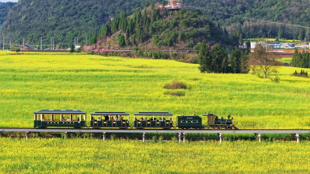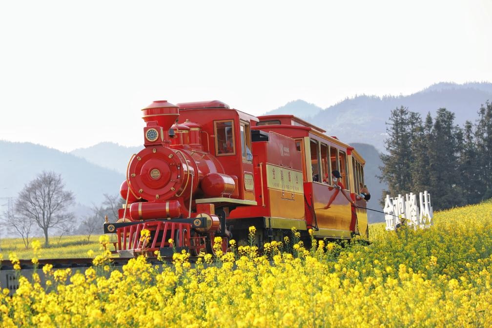 شفا – كونمينغ 2 مارس 2026 (شينخوا) في الصورة الملتقطة يوم 27 فبراير 2026، قطار سياحي صغير يسير بين حقول زهور الكانولا في محافظة لوهبينغ بمقاطعة يوننان في جنوب غربي الصين.
