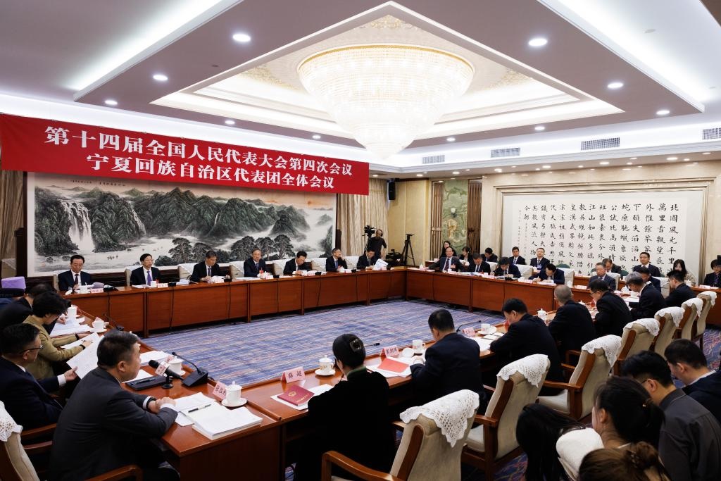 شفا – بكين 7 مارس 2026 (شينخوا) في الصورة الملتقطة يوم 6 مارس 2026، جانب من اجتماع جماعي لنواب وفد منطقة نينغشيا ذاتية الحكم لقومية هوي في الدورة الرابعة للمجلس الوطني الـ14 لنواب الشعب الصيني في بكين.