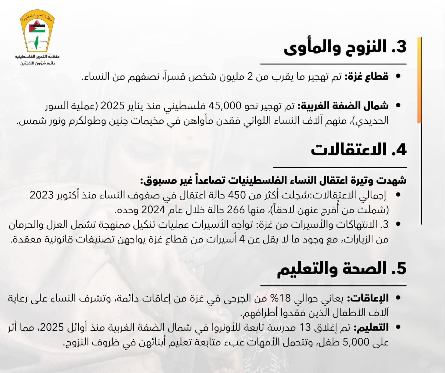 وأضاف أن النساء الفلسطينيات في قطاع غزة وفي مخيمات شمال الضفة الغربية (جنين وطولكرم ونور شمس) وفي مخيمات الشتات يعشن واحدة من أقسى المآسي الإنسانية في التاريخ المعاصر، في ظل حرب الإبادة التي خلفت آلاف الشهداء والجرحى، ودمرت الأحياء السكنية ومخيمات اللاجئين، ودفعت مئات الآلاف من العائلات إلى النزوح القسري وفقدان مقومات الحياة الأساسية، الأمر الذي جعل المرأة الفلسطينية تتحمل العبء الأكبر في حماية الأسرة ورعاية الأطفال والحفاظ على تماسك المجتمع في ظروف إنسانية كارثية.