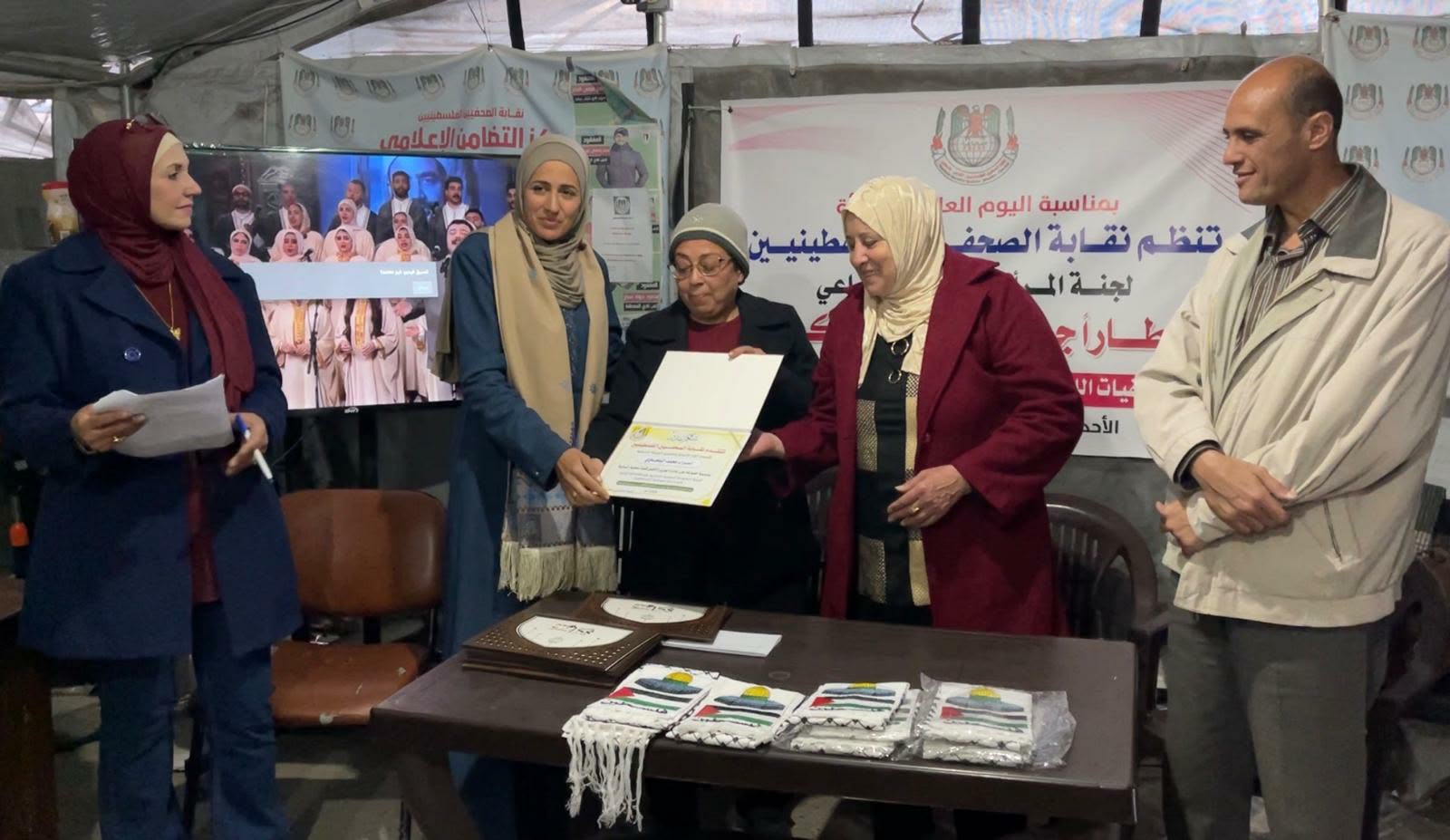 وفي ختام اللقاء الذي أدارته الأستاذة شيرين الكيالي عضو لجنة المراة والنوع الاجتماعي بالنقابة جرى تكريم عدد من الصحفيات الحاصلات على جوائز دولية ومحلية وعلى رأسهن الزميلة الشهيدة مريم أبو دقة.