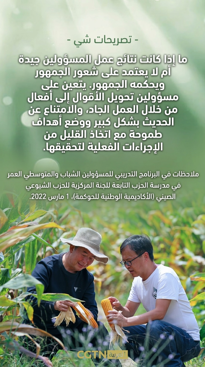 شفا - CGTN - أكد الرئيس الصيني شي جين بينغ على أهمية أن يمتلك المسؤولون الصينيون فهما صحيحا لمعنى الأداء الجيد، وأن يتخذوا إجراءات ملموسة لتحقيق فوائد حقيقية للشعب. فيما يلي بعض التصريحات الرئيسية للرئيس شي حول هذا الموضوع.