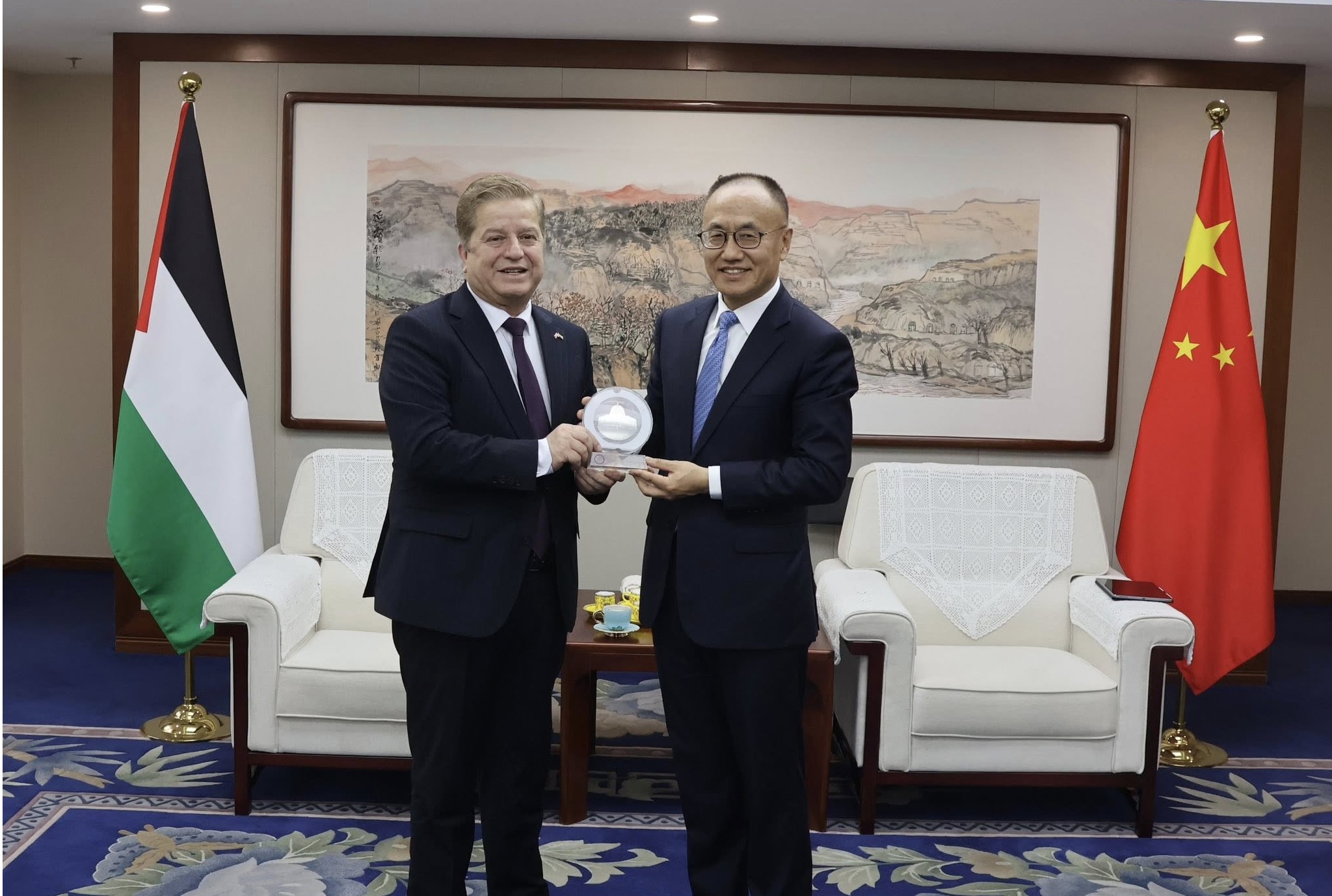 كما عبّر عن تقدير بلاده لموقف دولة فلسطين الثابت في الالتزام بمبدأ الصين الواحدة، مؤكداً استمرار الصين في تقديم الدعم للشعب الفلسطيني من خلال برامج التدريب، والمشاريع التنموية، والمساعدات الإنسانية، بما يخدم التنمية الاقتصادية والاجتماعية في فلسطين.