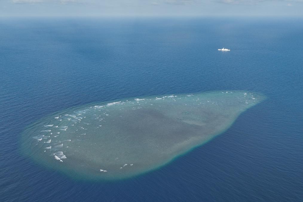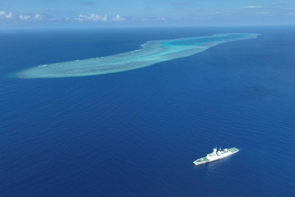 شفا – بحر الصين الجنوبي 28 مارس 2026 (شينخوا) في الصورة الجوية الملتقطة بطائرة بدون طيار يوم 24 مارس 2026، سفينة خفر السواحل الصيني “ساندو” تجري دورية بالقرب من أحد الشعاب المرجانية في بحر الصين الجنوبي.