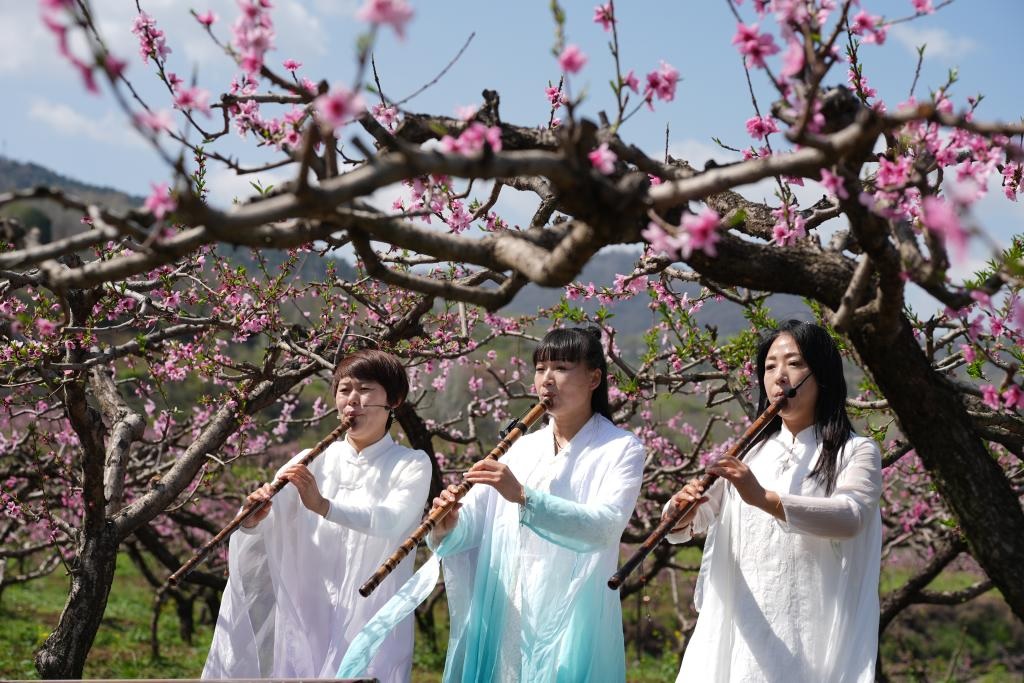 شفا – شيآن أول أبريل 2026 (شينخوا) في الصورة الملتقطة يوم 31 مارس 2026، هواة العزف على الآلات الموسيقية التقليدية الصينية يقدمن عروضا موسيقية في حي تشانغآن بمدينة شيآن، حاضرة مقاطعة شنشي بشمال غربي الصين، حيث يتدفق الزوار إلى المواقع الطبيعية للتمتع بمناظر الزهور المتفتحة الجميلة مع حلول موسم الربيع.