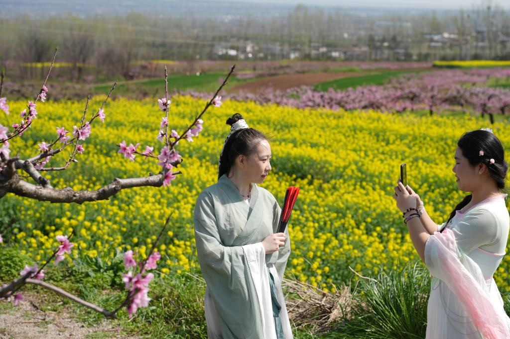 شفا – شيآن أول أبريل 2026 (شينخوا) في الصورة الملتقطة يوم 31 مارس 2026، زائرتان تأخذان صورا في حي تشانغآن بمدينة شيآن، حاضرة مقاطعة شنشي بشمال غربي الصين، حيث يتدفق الزوار إلى المواقع الطبيعية للتمتع بمناظر الزهور المتفتحة الجميلة مع حلول موسم الربيع.