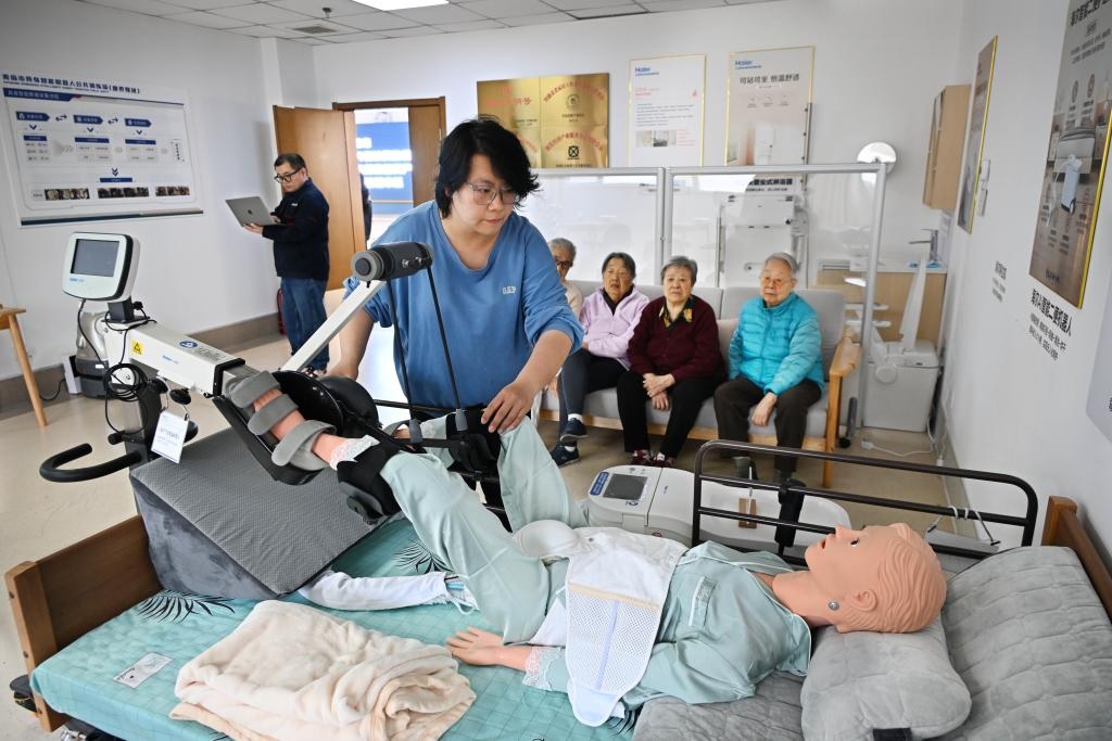 شفا – تشينغداو 10 أبريل 2026 (شينخوا) في الصورة الملتقطة يوم 9 أبريل 2026، موظفة تعرض وظائف روبوت إعادة التأهيل في مركز تشينغداو للتدريب على روبوتات رعاية المسنين بمدينة تشينغداو في مقاطعة شاندونغ بشرقي الصين.