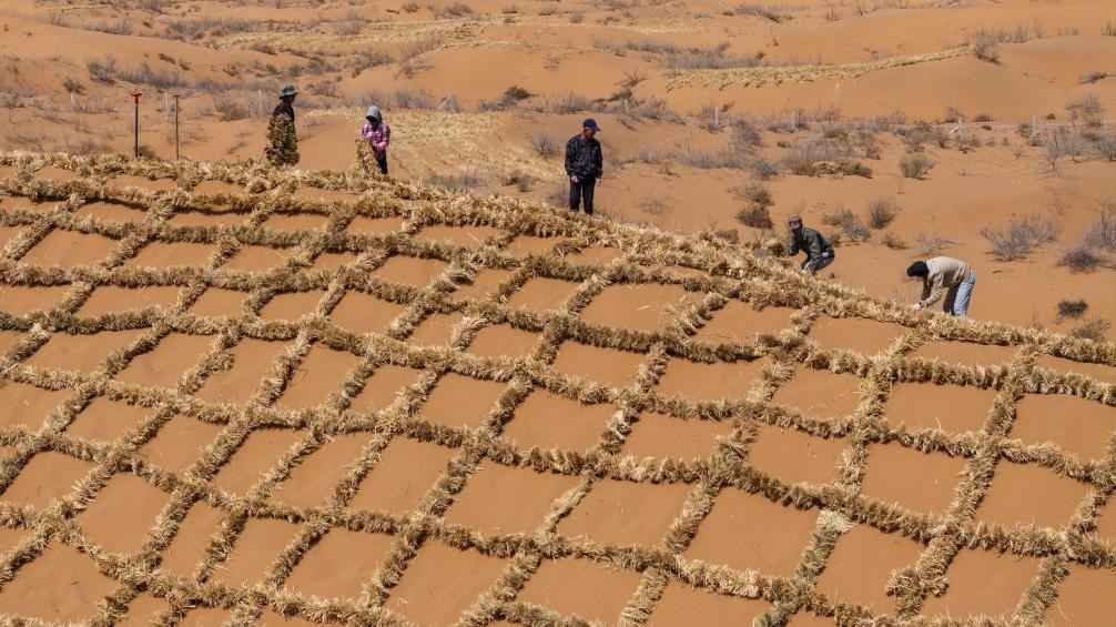 شفا – تشونغوي 12 أبريل 2026 (شينخوا) في الصورة الملتقطة يوم 10 أبريل 2026، عمال يقومون بزراعة مربعات القش في صحراء تنغر بمنطقة نينغشيا ذاتية الحكم لقومية هوي في شمال غربي الصين.