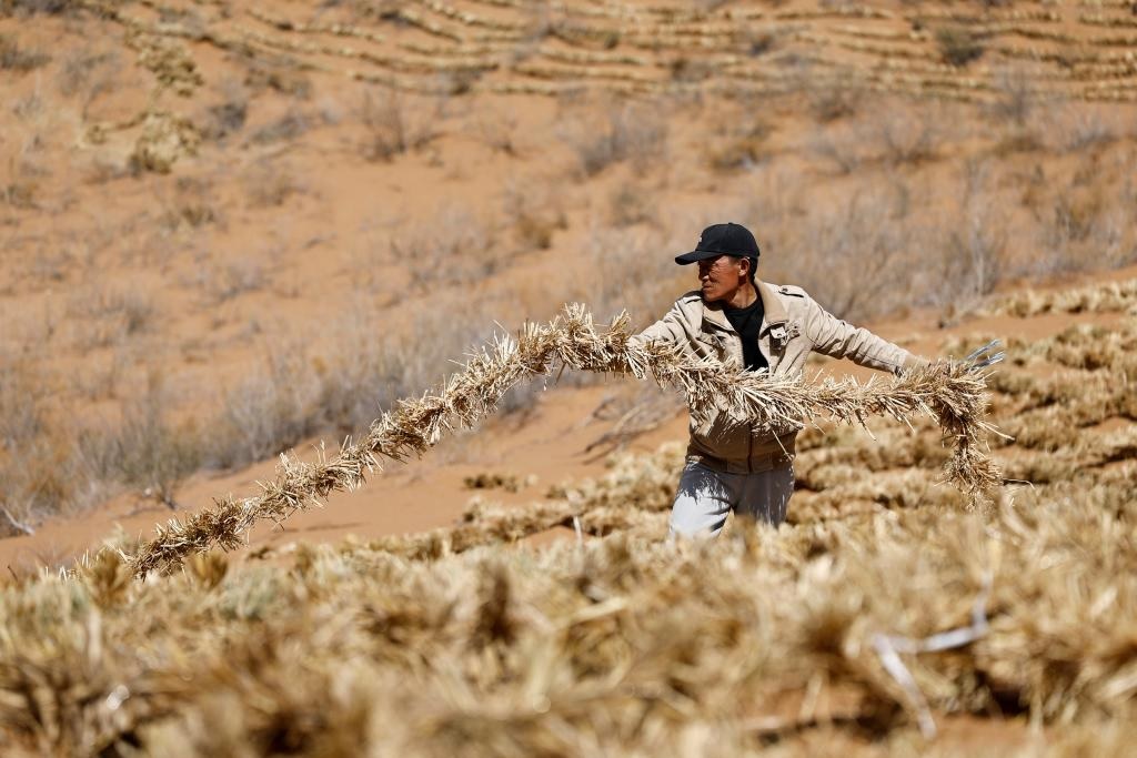شفا – تشونغوي 12 أبريل 2026 (شينخوا) في الصورة الملتقطة يوم 10 أبريل 2026، عامل يقوم بزراعة مربعات القش في صحراء تنغر بمنطقة نينغشيا ذاتية الحكم لقومية هوي في شمال غربي الصين.