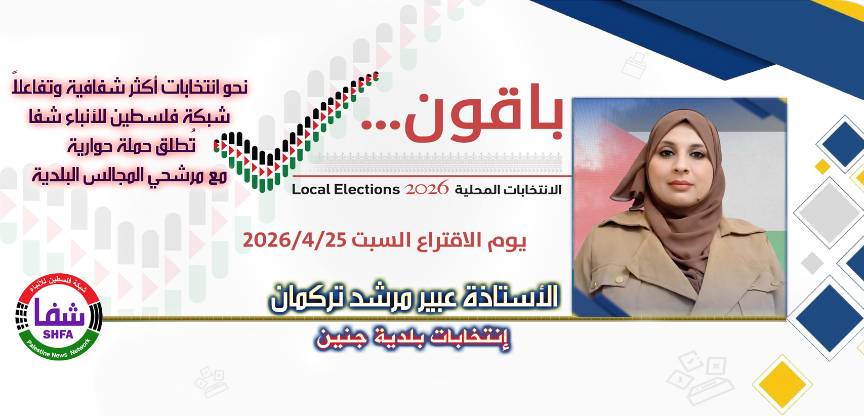 وفي إطار الحملة، يشارك العديد من الشخصيات المرشحة للانتخابات المحلية، ومن بينهم الأستاذة “عبير مرشد تركمان“، المرشحة لعضوية المجلس البلدي في “مدينة جنين”، ومن خلال هذه الحملة، سيتم تسليط الضوء على رؤيتها وبرنامجها الانتخابي، حيث تقدم أفكارها حول كيفية تحسين الخدمات المحلية وتنمية المدينة بما يتناسب مع تطلعات المواطنين.