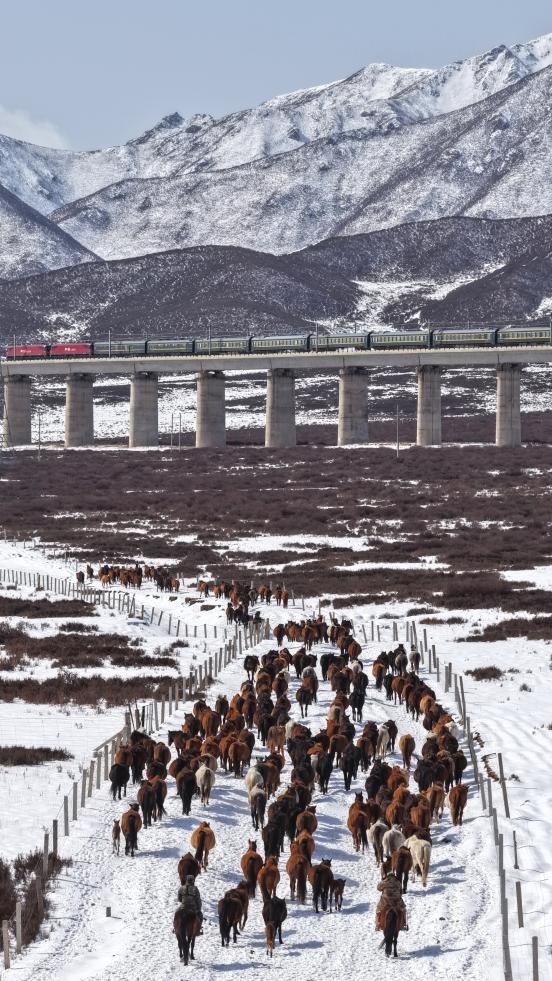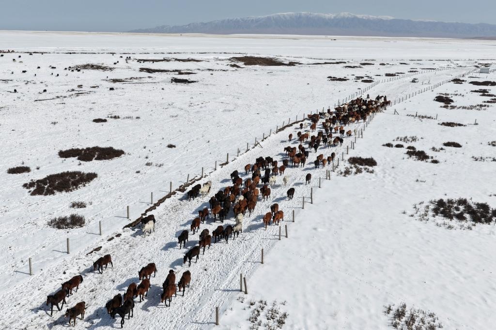 شفا – تشانغيه 15 أبريل 2026 (شينخوا) في الصورة الملتقطة يوم 14 أبريل 2026، خيول مزرعة شاندان لتربية الخيول في مقاطعة قانسو بشمال غربي الصين. وخلال موسم الحراثة، بدأ الرعاة في توجيه قطعان الخيول للانتقال من الأراضي الزراعية إلى المراعي الطبيعية.