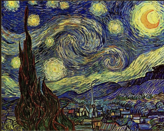 الصورة أدناه للوحة عالمية بعنوان: “لَيلَة النُجوم على نَهر الرون” للرَسام الهولندي (فينسنت فان جوخ).