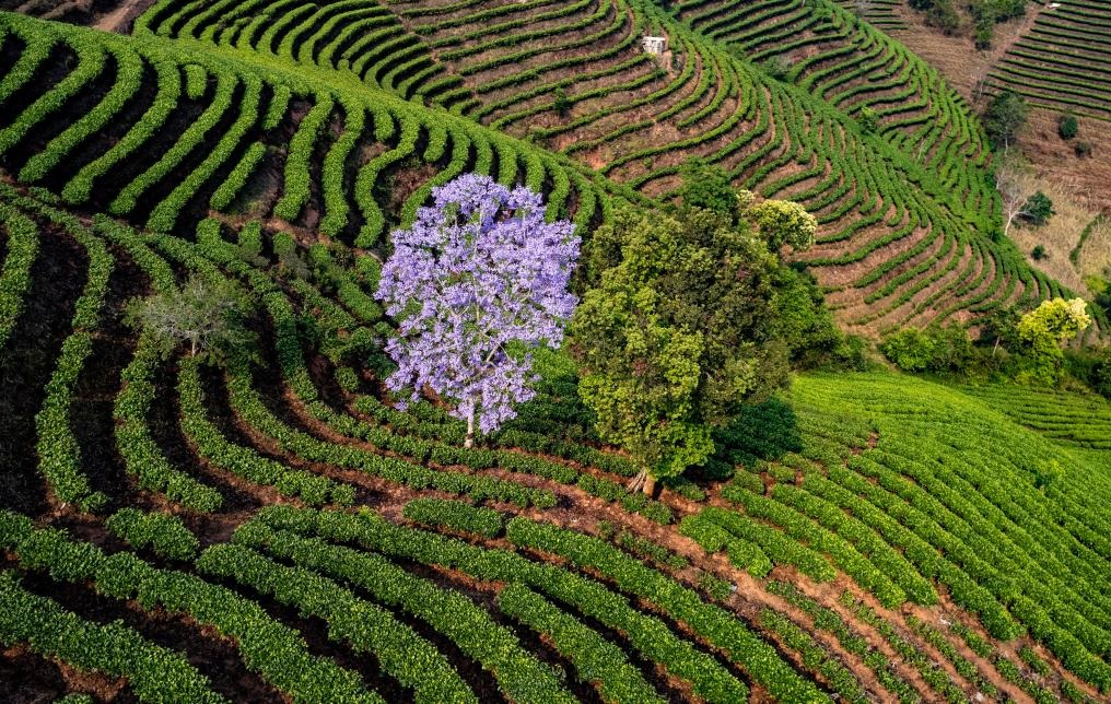 شفا – بوأر 16 أبريل 2026 (شينخوا) في الصورة الملتقطة يوم 15 أبريل 2026، منظر جوي لجبل أشجار الشاي في حي سيماو بمدينة بوأر في مقاطعة يوننان بجنوب غربي الصين.