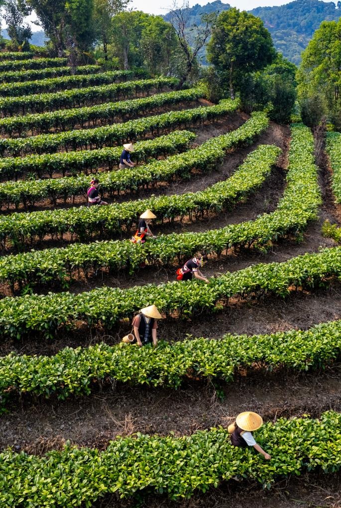 شفا – بوأر 16 أبريل 2026 (شينخوا) في الصورة الملتقطة يوم 15 أبريل 2026، مزارعون يقطفون أوراق الشاي الربيعي في حي سيماو بمدينة بوأر في مقاطعة يوننان بجنوب غربي الصين.