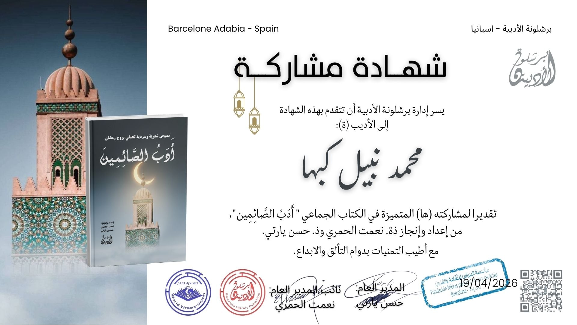 شفا – شارك الفيلسوف والمفكر الإسلامي والداعية والأديب الفلسطيني م.محمد نبيل كبها إلى جانب ٥٠ من النخبة الأدبية على مستوى العالم في اعداد كتاب بعنوان “أدب الصائمين” عبر برشلونة الأدبية في اسبانيا.
