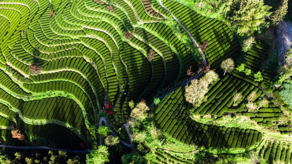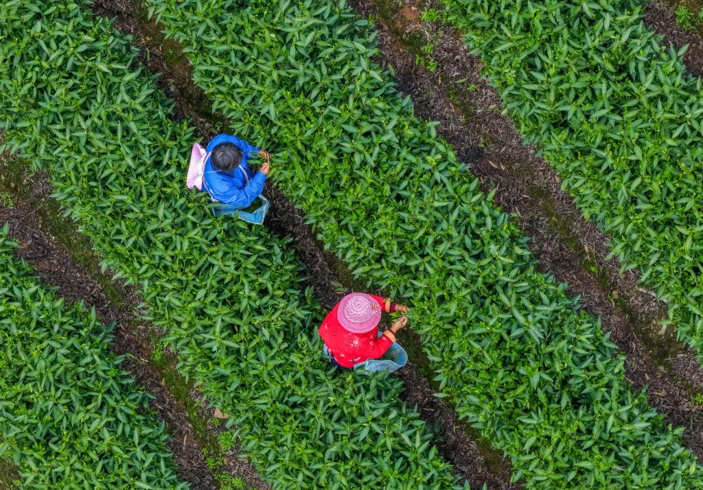 شفا – بكين 21 أبريل 2026 (شينخوا) في الصورة الملتقطة يوم 18 أبريل 2026، مزارعون يقطفون أوراق الشاي في قرية هواتشيشان بولاية أنشي ذاتية الحكم لقوميتي توجيا ومياو بمقاطعة هوبي في وسط الصين.