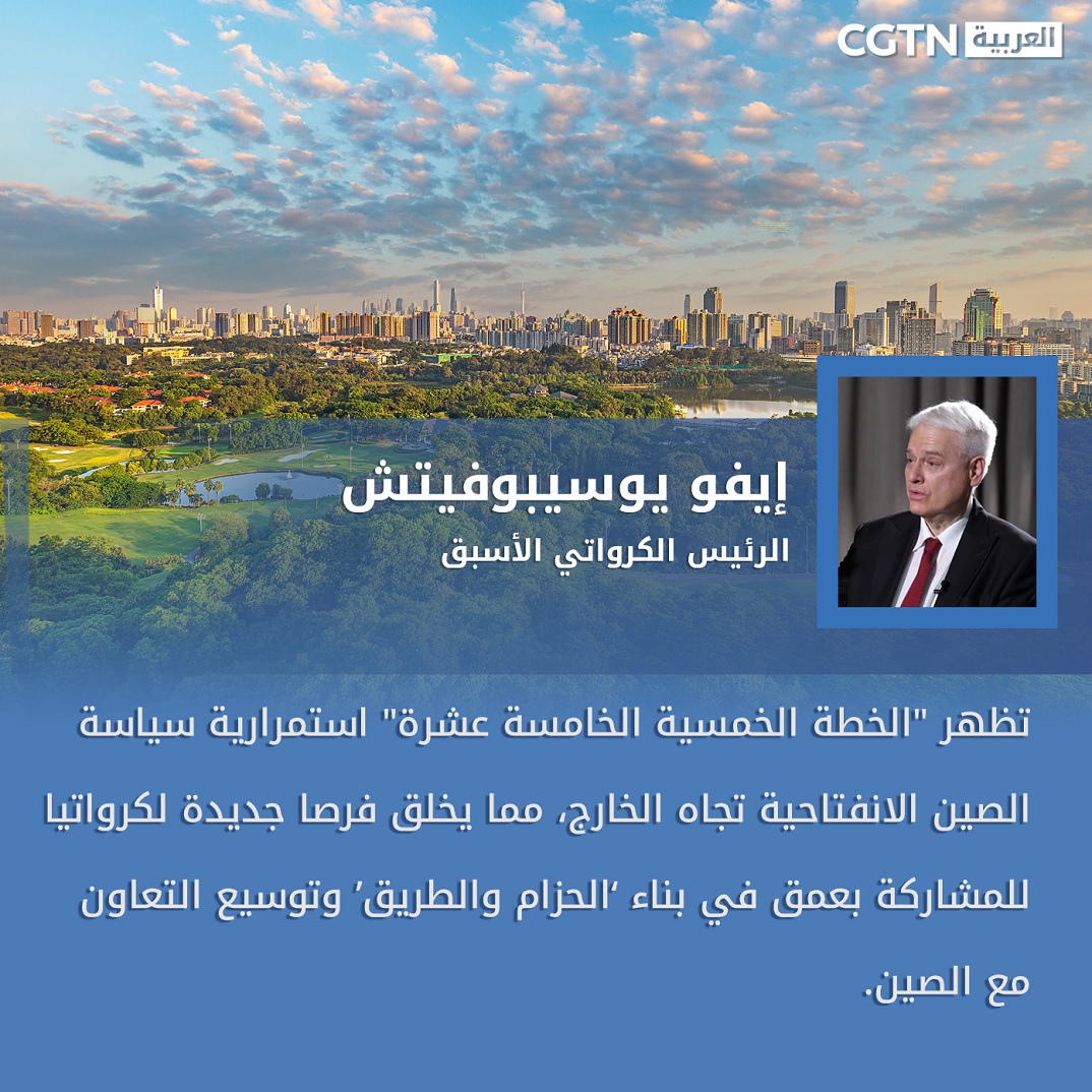 شفا – CGTN – في الآونة الأخيرة، أجرت مجموعة الصين للإعلام مقابلة خاصة مع الرئيس الكرواتي الأسبق إيفو يوسيبوفيتش. عندما تحدث عن “الخطة الخمسية الخامسة عشرة” الصينية، قال يوسيبوفيتش: “تظهر هذه الخطة استمرارية سياسة الصين الانفتاحية تجاه الخارج، مما يخلق فرصا جديدة لكرواتيا للمشاركة بعمق في بناء ’الحزام والطريق‘ وتوسيع التعاون مع الصين”.